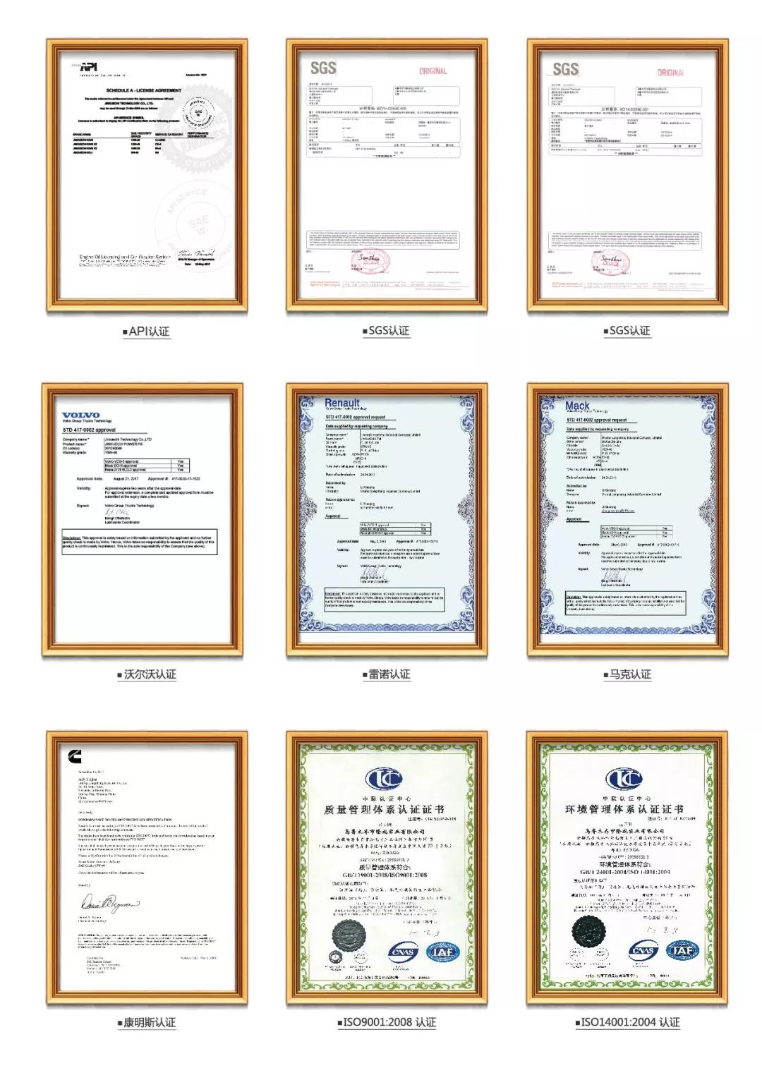 金雪馳追求卓越,金雪馳潤滑油除了滿足一般的美國API認證,還獲得了比API要求更為嚴苛的歐洲ACEA認證,同時取得了通過了瑞典沃爾沃、法國雷諾、美國康明斯、德國奔馳、寶馬等多家知名汽車廠商認證。