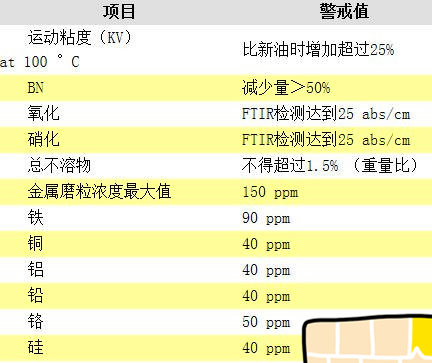 對(duì)于較大的天然氣發(fā)動(dòng)機(jī)組,例如工業(yè)天然氣發(fā)動(dòng)機(jī),或者機(jī)油用量較大的系統(tǒng)、較為關(guān)鍵的發(fā)動(dòng)機(jī),最好通過(guò)油液檢測(cè)來(lái)指導(dǎo)換油。油液檢測(cè)不但能檢測(cè)油質(zhì),還能監(jiān)控機(jī)組的異常,是預(yù)防天然氣發(fā)動(dòng)機(jī)組故障的有效手段。發(fā)動(dòng)機(jī)制造商會(huì)給出機(jī)油的換油指標(biāo),一般來(lái)說(shuō),天然氣發(fā)動(dòng)機(jī)油的換油指標(biāo)如下: