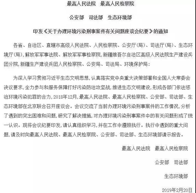 2月20日,為依法懲治環境污染違法犯罪活動,最高人民法院、最高人民檢察院、公安部、司法部、生態環境部聯合發布了《關于辦理環境污染刑事案件有關問題座談會紀要》,對當前辦理環境污染刑事案件中的重點難點問題作出回應和規定。