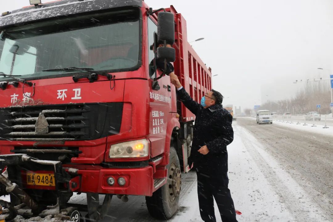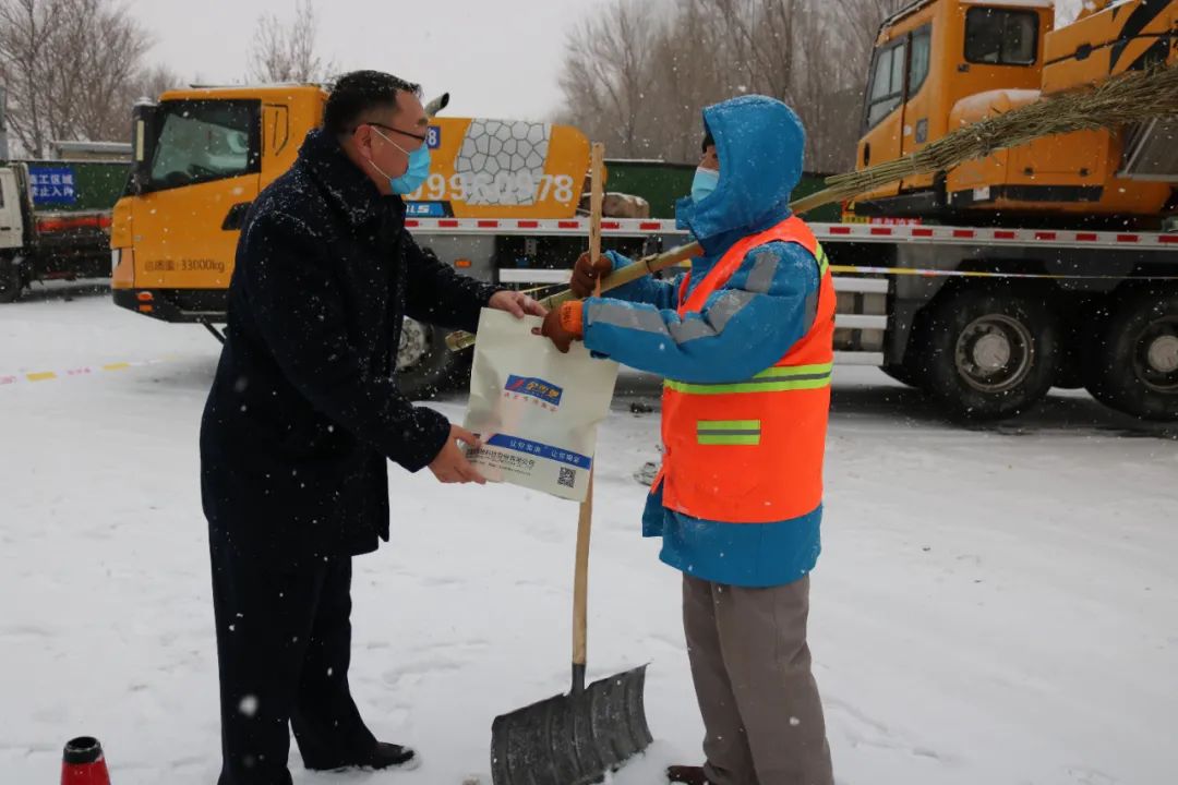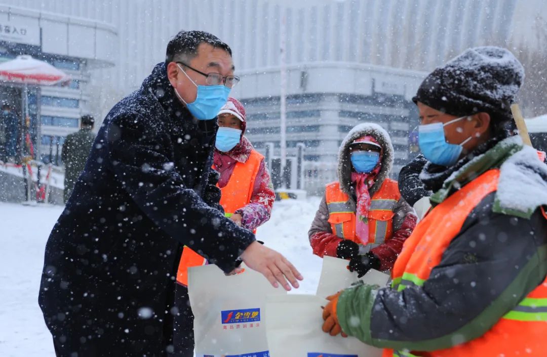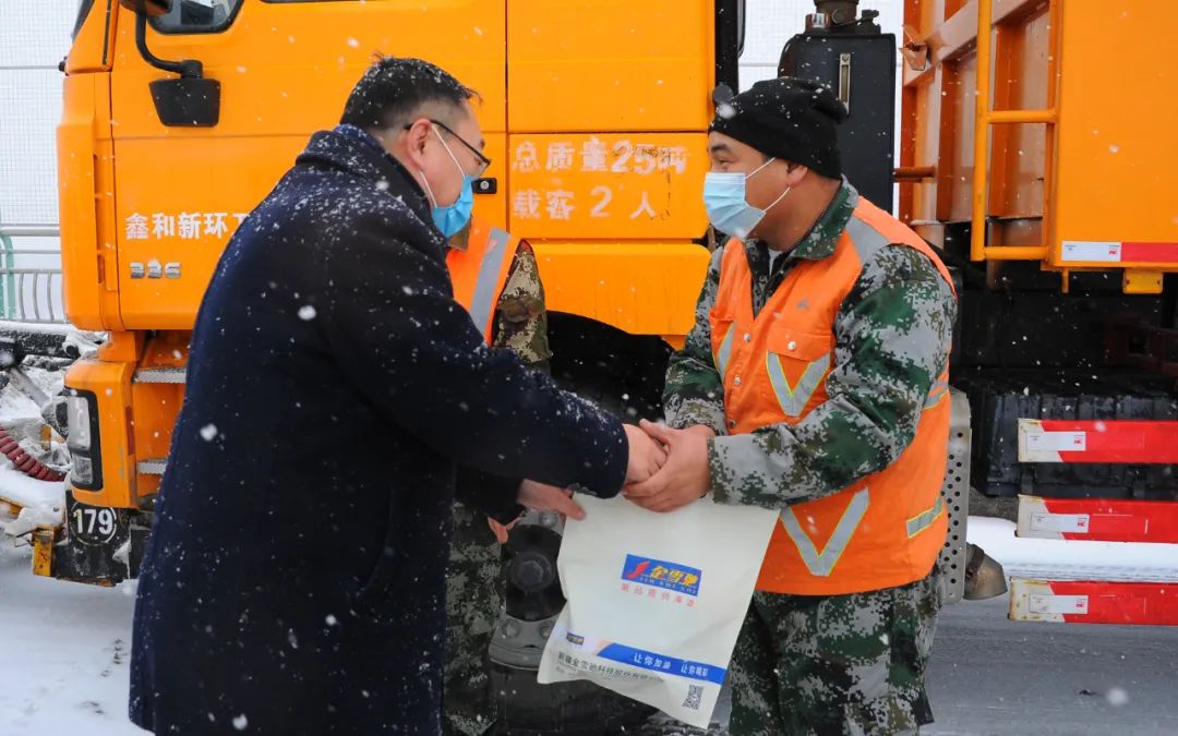 為表達對環衛工人們的敬意,給他們送去一份溫暖和關愛,2021年12月9日,新疆金雪馳科技股份有限公司組織開展為環衛工人送溫暖活動。新疆金雪馳科技股份有限公司副總經理庫國強先生代表公司慰問在大雪中辛苦工作的環衛工人,并送上精心準備的勞保用品,讓環衛工人們感受到冬日的“溫暖”。