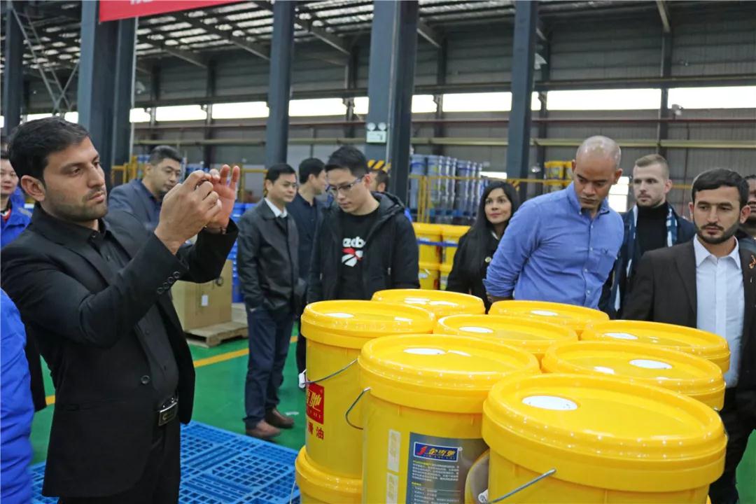 考察團一行在田總的陪同下,參觀了金雪馳年產能15萬噸高端潤滑油生產車間。從產品的原料管控、調和、灌裝到產品檢測、貼標、包裝、裝箱,考察團成員們看到了一桶桶金雪馳潤滑油誕生的全過程,生產車間處處體現了科技、智能和節能。