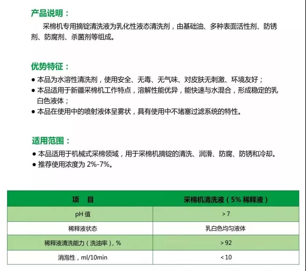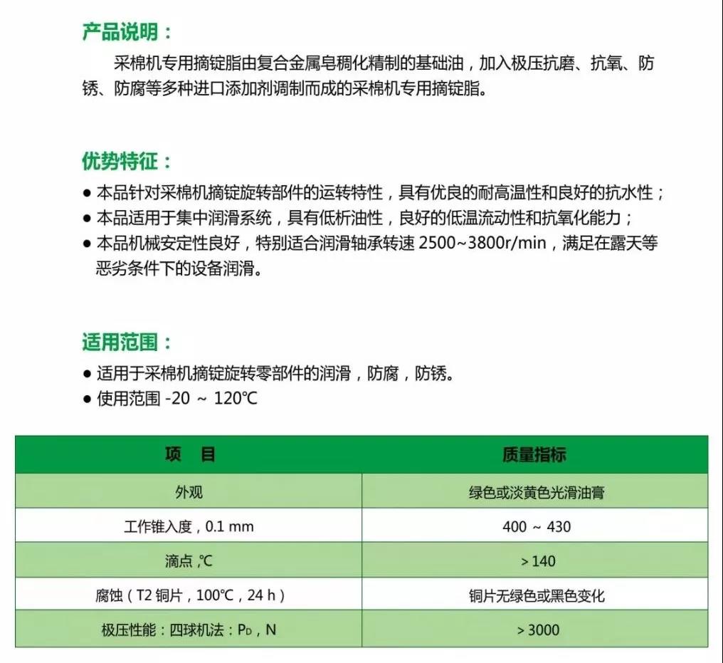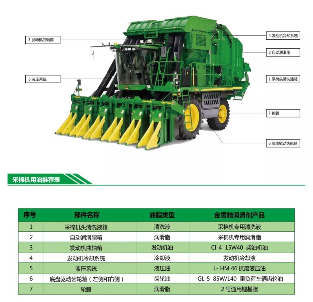 采棉機的工作時間較為集中,作業溫度高,機器長時間連續作業,各零部件之間磨損大,棉農們迫切需要可靠的潤滑產品和精準的技術支持來保障采棉效率。針對采棉機的特殊結構及使用要求,新疆金雪馳科技股份有限公司研發并推出了采棉機專用摘錠潤滑脂、采棉機專用摘錠清洗液和采棉機各部位需要的潤滑劑,并為廣大采棉機用戶提供全面的潤滑解決方案和技術服務。