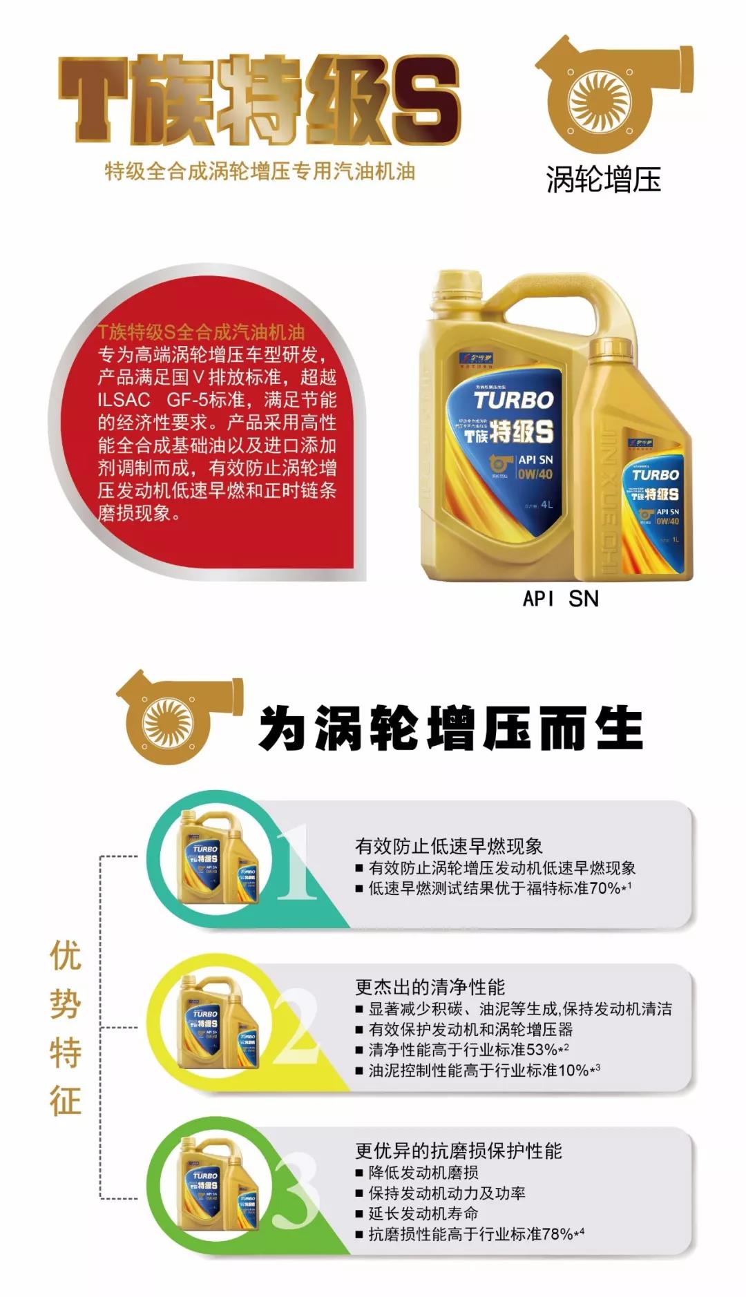 T族特級S全合成汽油機油專為高端渦輪增壓車型研發,產品滿足國Ⅴ排放標準,超越ILSAC GF-5標準,滿足節能法規要求。產品采用高性能全合成基礎油以及進口添加劑調制而成,有效防止渦輪增壓發動機低速早燃和正時鏈條磨損現象。