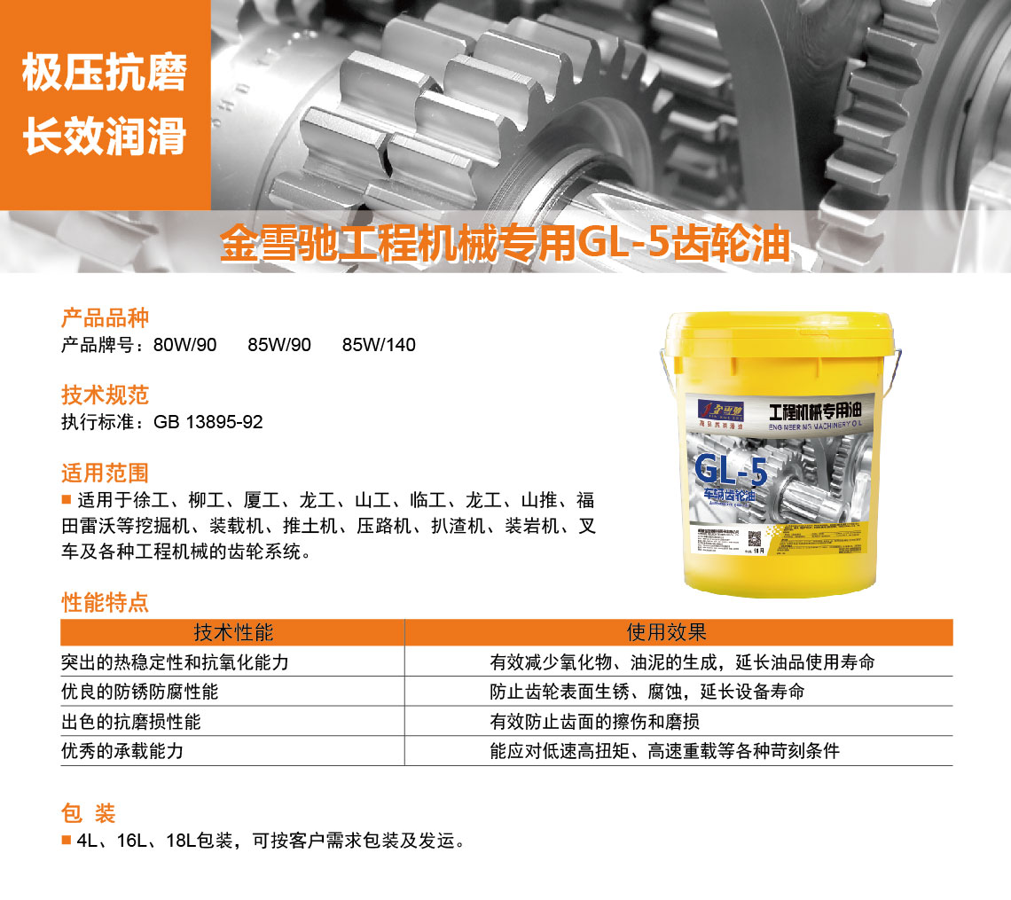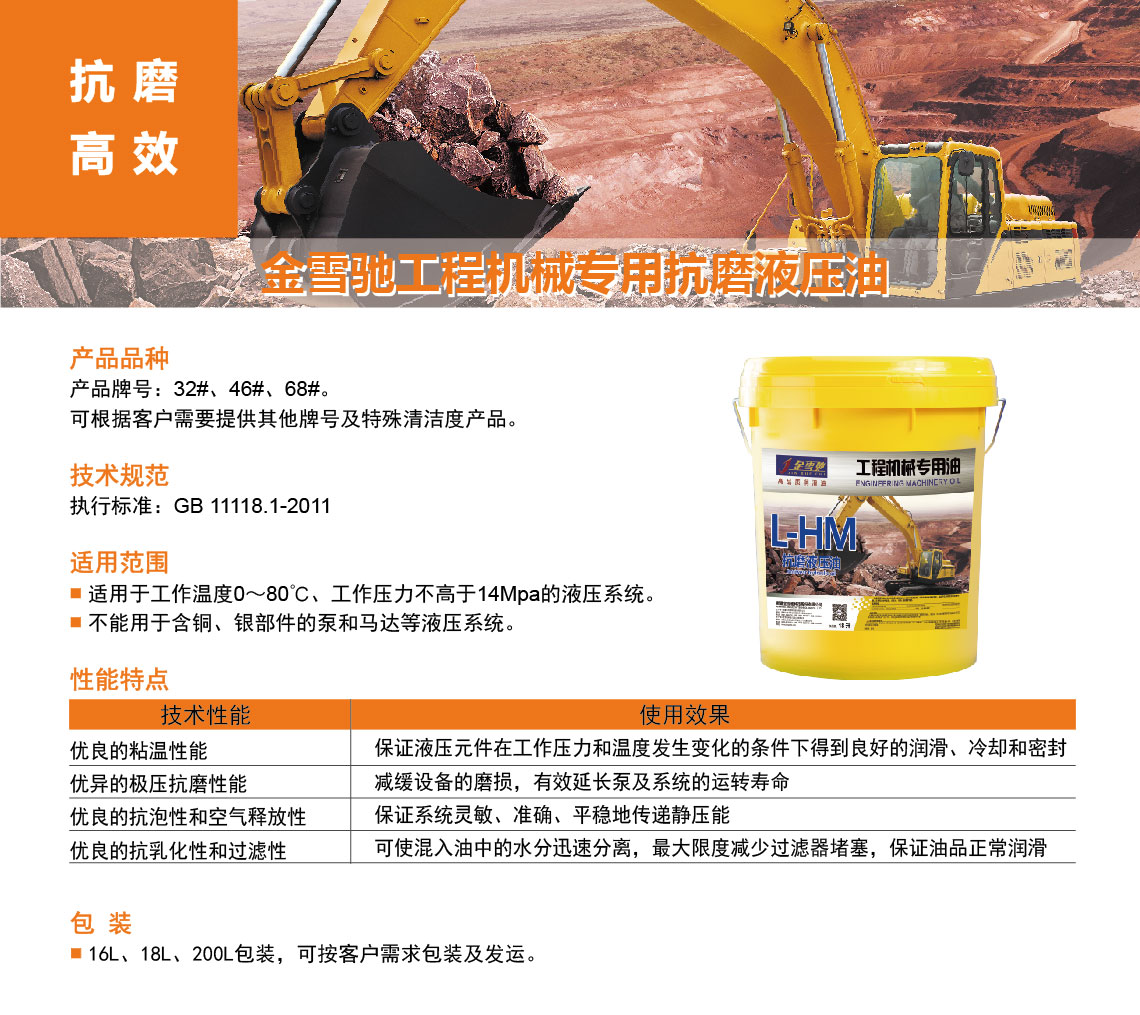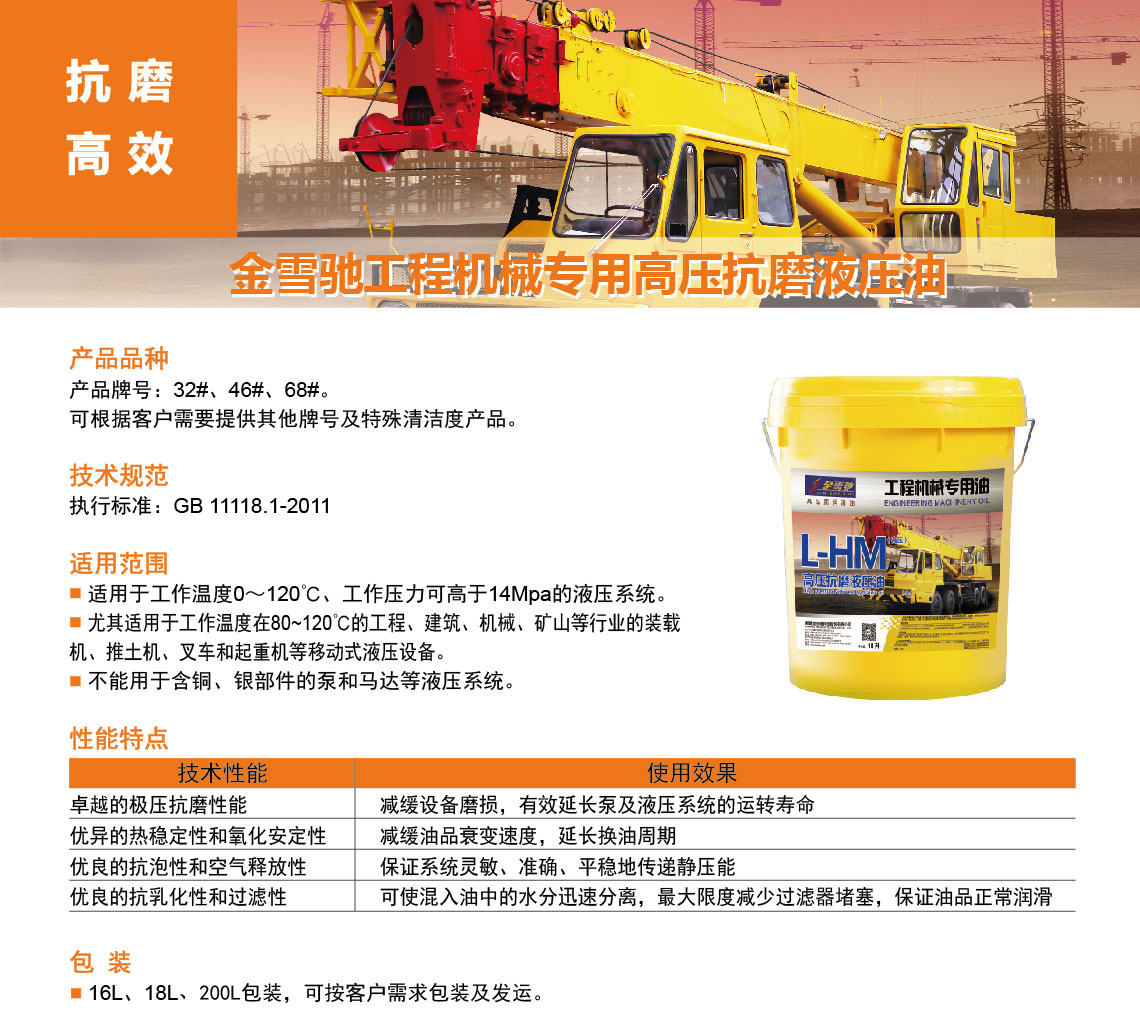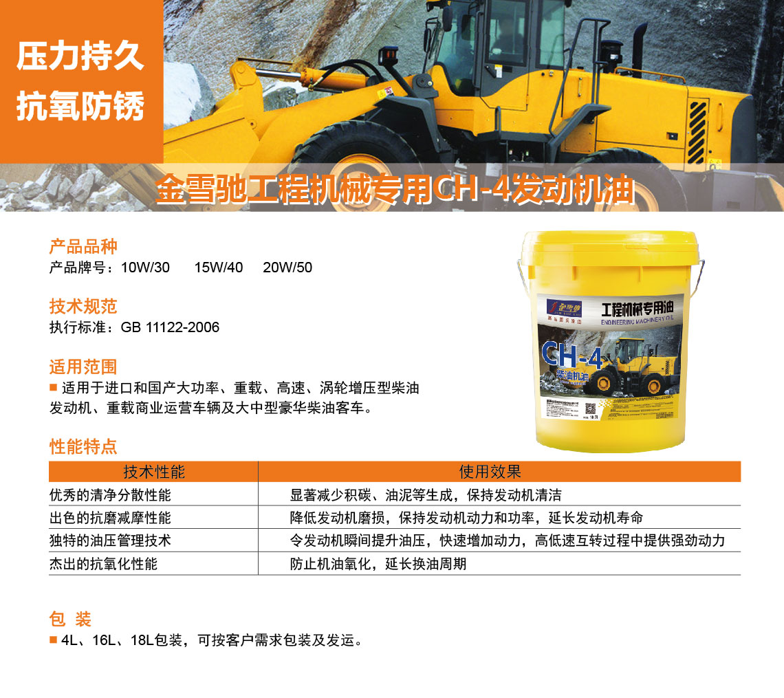 金雪馳潤滑油專注潤滑領域二十年,此次針對中國的國情路況、工況以及目前市場上工程機械設備的結構特點研發并重裝上市的金雪馳工程機械系列專用油,主要包括發動機油、抗磨液壓油、齒輪油、液力傳動油4個品類的6個品種,產品上市以來深受消費者的青睞。