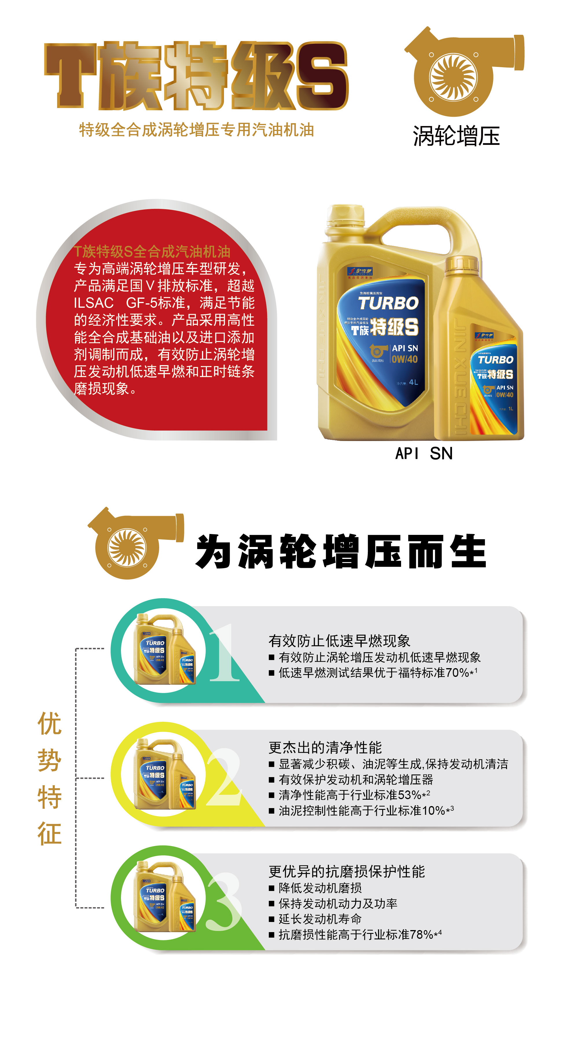 3月8日,金雪馳針對高端渦輪增壓發動機,推出了T族特級S特級全合成渦輪增壓專用汽油機油,產品適用于配備最新發動機技術的各類帶”T”進口和國產轎車,這款產品的誕生凝聚著金雪馳專注渦輪增壓的多年技術經驗,金雪馳科技股份是首家推出渦輪增壓發動機專用汽油機油的企業,它的誕生標志著金雪馳在渦輪增壓方面的技術創新又進了一步。
