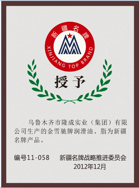 (金雪馳潤滑油榮獲新疆名牌產(chǎn)品)