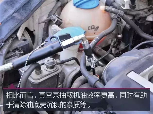 此外,還有一種利用真空泵抽取機(jī)油的方式。理論上,真空泵抽取機(jī)油可以更容易將油底殼沉積的雜質(zhì)吸出,去除雜質(zhì)的效果理論上會(huì)更好。但所需要的設(shè)備要求會(huì)比較高!