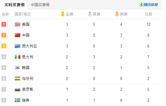 截止目前,中國已經(jīng)獲得了3枚金牌,2枚銀牌,3枚銅牌,共計8枚獎牌。