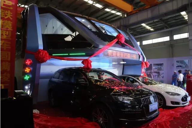 我國自行設計研制的“空中巴士”——巴鐵1號試驗車,在河北秦皇島北戴河區(qū)啟動綜合試驗。車廂長22米,寬7.8米,高4.8米,載客數(shù)300人。車廂內(nèi)有多個液晶電視屏幕,還安裝4個動態(tài)地圖,下層鏤空部分可行駛高度2米以下...